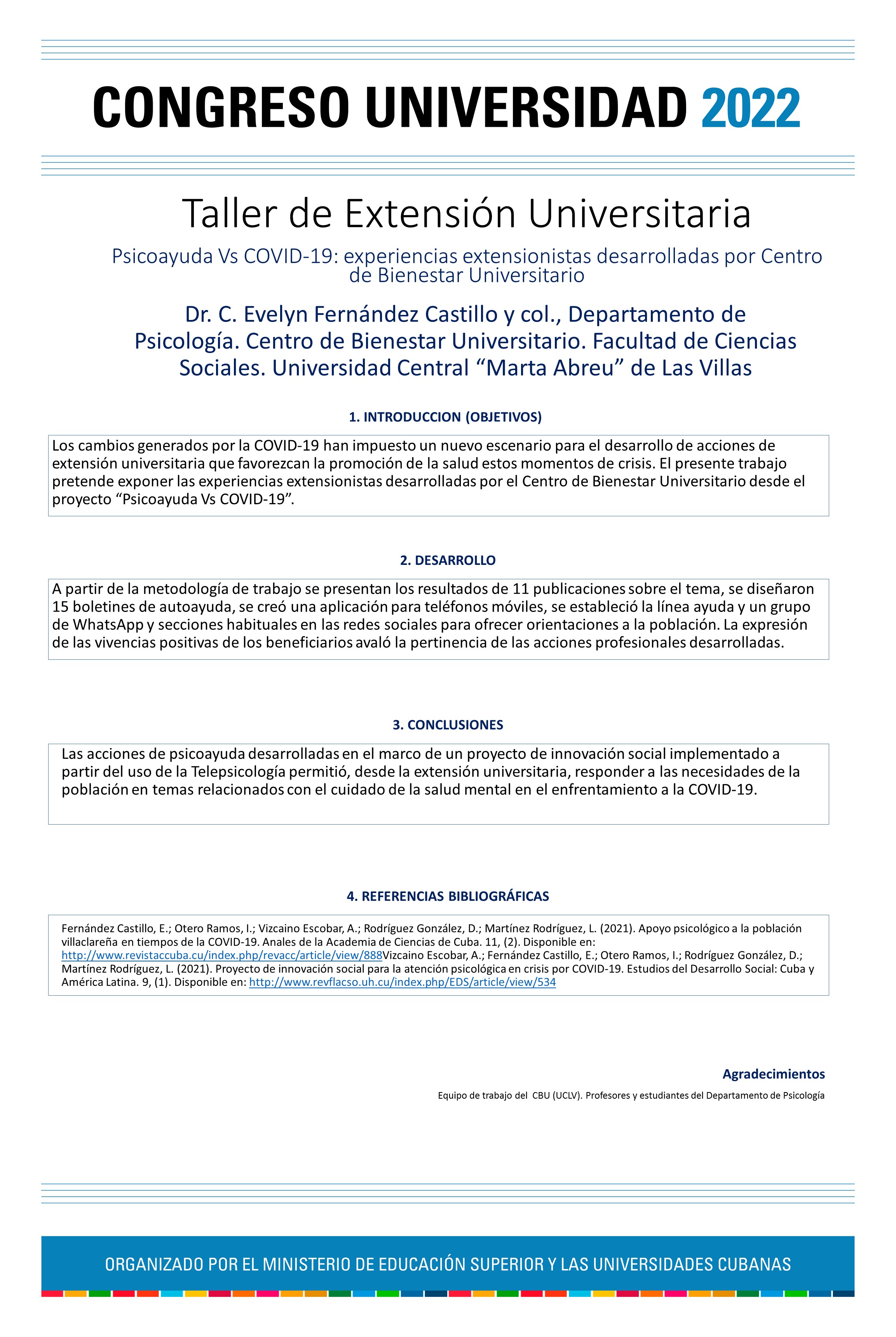 Los cambios generados por la COVID-19 han impuesto un nuevo escenario para el desarrollo de acciones de extensión universitaria que favorezcan la promoción de la salud en estos momentos de crisis. El presente trabajo pretende reflexionar sobre las experiencias extensionistas desarrolladas por el Centro de Bienestar Universitario desde el proyecto “Psicoayuda Vs COVID-19”. A partir de la metodología de trabajo se presentaron los resultados de 11 publicaciones sobre el tema, se diseñaron 15 boletines de autoayuda, se creó una aplicación para teléfonos móviles, se estableció la línea ayuda y un grupo de WhatsApp y secciones habituales en las redes sociales para ofrecer orientaciones a la población. La expresión de las vivencias positivas de los beneficiarios avaló la pertinencia de las acciones profesionales desarrolladas. Las acciones iniciales de Psicoayuda desarrolladas en el marco de un proyecto de innovación social implementado a partir del uso de la Telepsicología permitió, desde la extensión universitaria, responder a las necesidades de la población en temas relacionados con el cuidado de la salud mental en el enfrentamiento a la COVID-19.